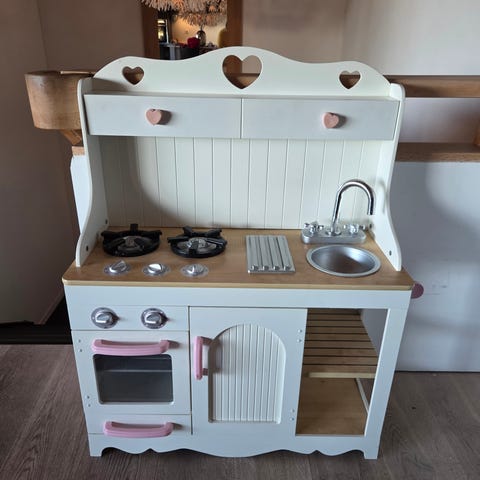 Yngri lekekjøkken i tre med komfyr, vask med metallskål, og ovn. Kjøkkenet har flere detaljer som knapper og symboler for temperaturer og matvarer. Designet for barn og laget i lyst tre med pastellfarger. Pent brukt