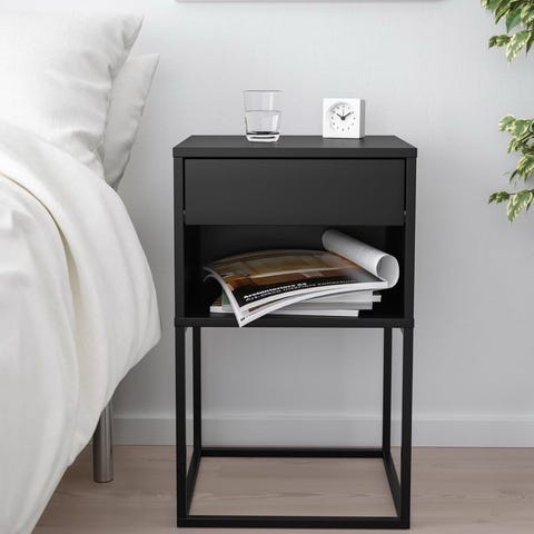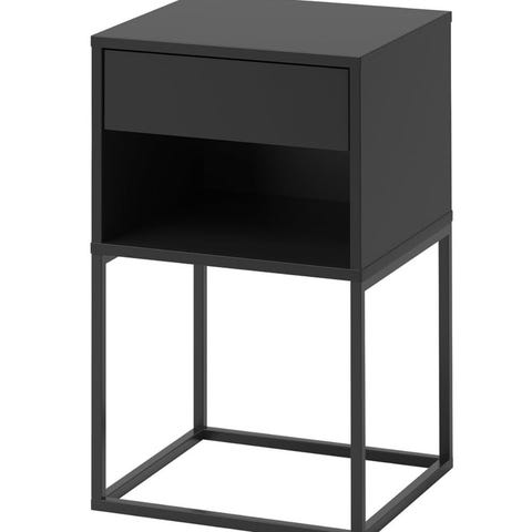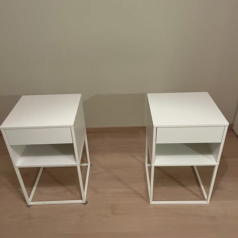 Selger et VIKHAMMER nattbord fra IKEA. Det har noen merker på overflaten, men ingen dype skader. Nattbordet fungerer helt fint, og merkene kan trolig enkelt males over dersom man ønsker at de ikke skal være synlige.