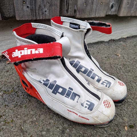 Alpina skisko, str. 35, modell ERJ. Litt små i størrelsen. Kombisko som gir god ankelstøtte. Noe sprukket skinn øverst ved åpningen, men ellers i fin stand.