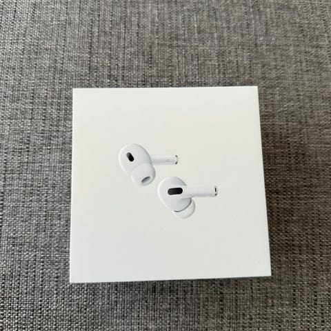 Apple AirPods Pro 2. generasjon trådløse hodetelefoner med MagSafe ladeetui. Produktet inkluderer ladekabel og støtter trådløs lading via MagSafe. Designet for å gi aktiv støydemping og forbedret lydkvalitet. Kun tatt opp og sett på