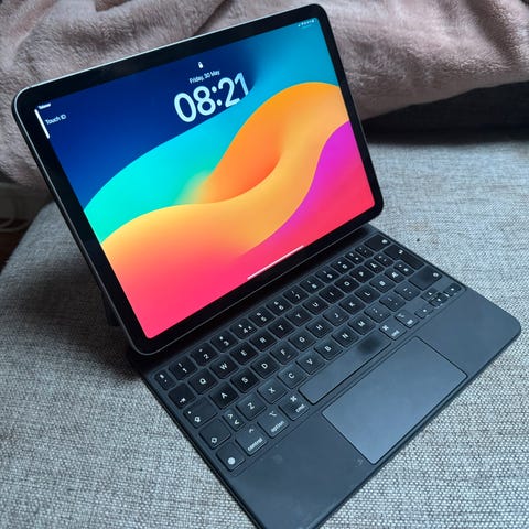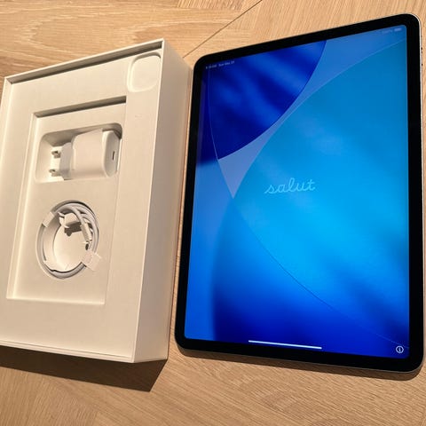 Apple iPad Air 11-inch (M2) WiFi + cellular 128 GB BLUE selges grunnet overgang til Pro. Det ligger skjermbeskytter på iPaden per nå, denne kan tas av før salg. Et lite hakk ved siden av fingersensoren, ringet ut på bilde, men har ingenting å si for bruken. Små hairlines rundt ladekontakt. Aldri vært skadet. Batterikapasitet på 100%. Kjøpt ny fra Eplehuset i januar 2025. Apple care+ til januar 2026.