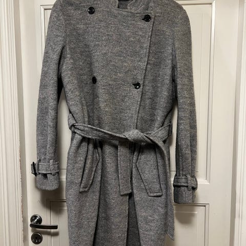 Kåpen er en blanding av polyester og ull. En av knappene er ulik resterende, da den originale knappen falt av og ble borte.