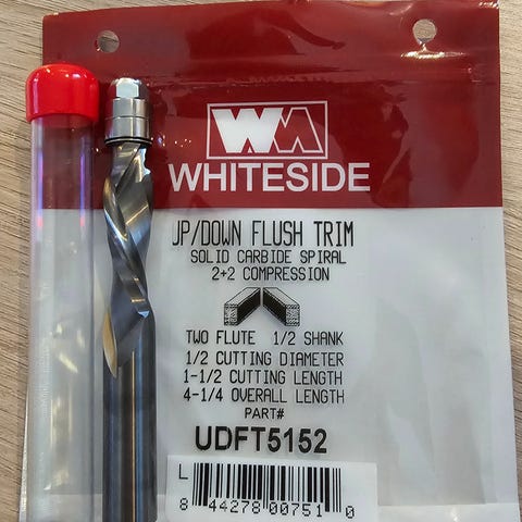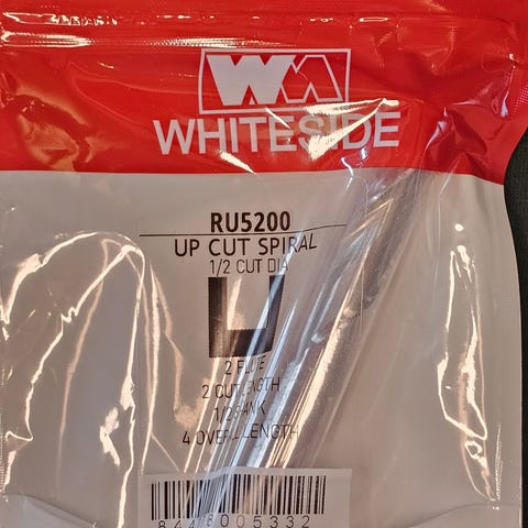 Jeg selger ny og uåpnet Whiteside RD2100 down-cut spiral (¼″ skaft), helt perfekt når du vil ha ekstra pen overside og minimalt med flising i plater!
