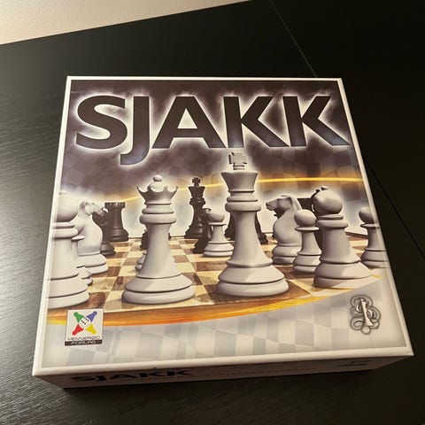 Selger et sjakkspill med sammenleggbart brett og brikker i svart og hvitt.