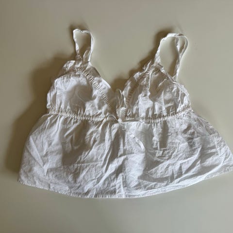 Hvit sommerlig singlet med blomster. Den er i størrelse XS og er laget av 100% bomull