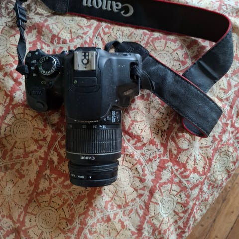 Canon EOS 1100D digitalkamera med medfølgende batterilader og håndbok på svensk. Kameraet har et standardobjektiv 18-55 mm objektiv med makrofunksjonen. Med en skulderrem og en flott fotobag til oppbevaring. Passer for nybegynnere.