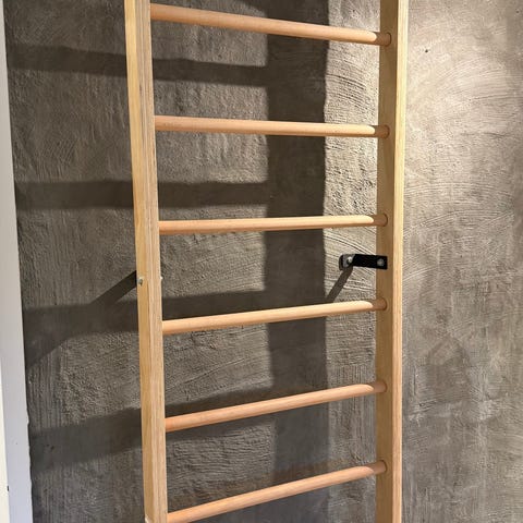 Ribbevegg brukes ikke lenger. 230 cm høy og 70 cm bred. Alt i tre + metallplater til veggmontering.