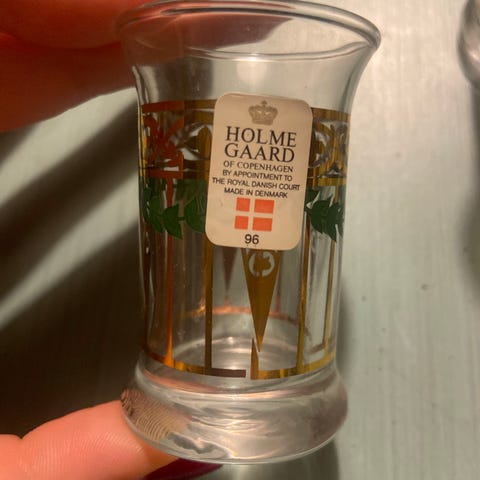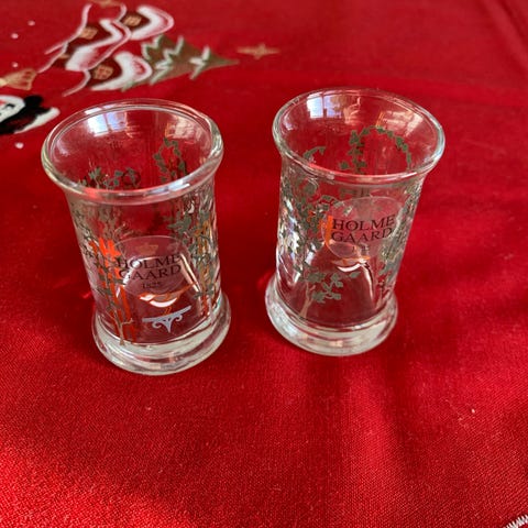 Holmegaard glasskaraffel med to tilhørende glass med julemotiv.