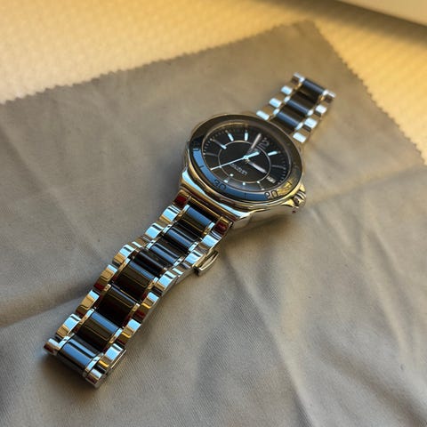 Dette er en Omega Constellation Quartz-klokke for menn i rustfritt stål og gult gull med svart urskive og datovisning.kan sendes Pris 13300kr