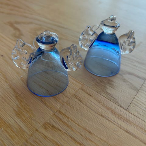 2 stk Engler i frostet glass. Ligger i original esken. Meget dekorativ julepynt designet av Maud Gjeruldsen Bugge. Selges 250kr + porto. Eller hentes i Haugesund etter avtale.