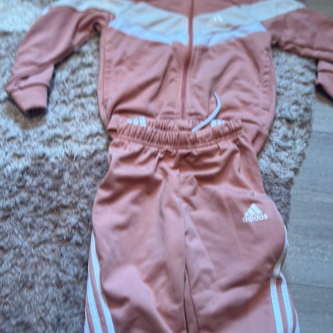 Adidas joggedress i rosa. Den er i str 18-24 mnd, ble brukt her fra 86 til 92. Det har fått noe merker, har tatt bilde av det jeg har sett. Ellers i god stand og lite brukt.