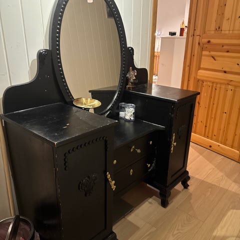 Antikk svart sminkebord med speil, to skap med dører og flere skuffer. Møbelet har dekorative detaljer og messingbeslag. Passer til oppbevaring av sminke og tilbehør.