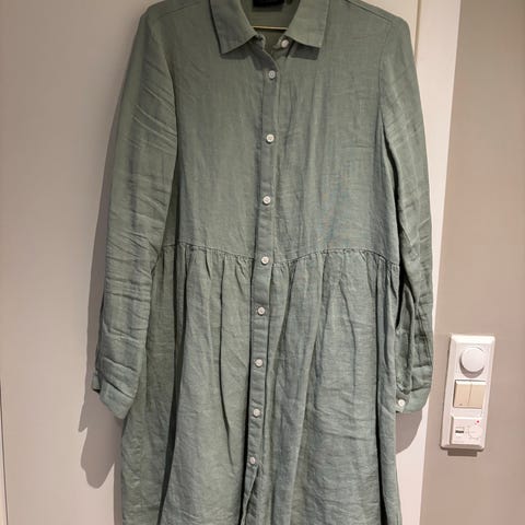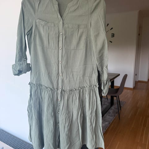 hverdagskjole i fargen grønn, størrelse 36. Kjolen er laget av bomull og har knapper foran, langermet design, og en snøring i midjen for justering.