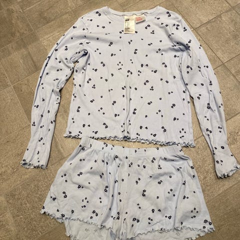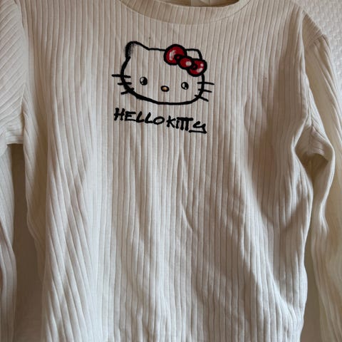 Lite bruk hello kitty pjs str 140. Bukse har vid fasong. Top er nesten ikke bruk. Tynn bomull psj.