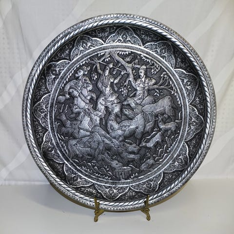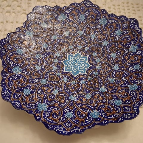 Vakkert, håndlaget dekorasjonsfat fra Isfahan, Iran. Tradisjonell persisk qalamzani med detaljerte geometriske mønstre.