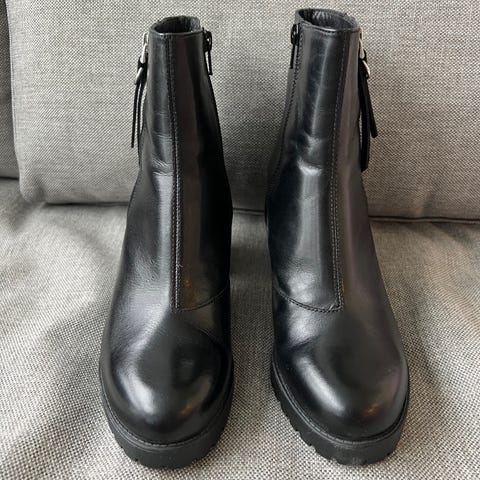 Sorte ankelstøvletter i skinn, størrelse 37. Klassisk og tidløs modell med lav hæl og solid såle som gir god komfort. Glidelås på siden gjør dem enkle å ta av og på. Pent og veldig lite brukt og i svært god stand, med lite slitasje under sålen. Nypris ca. 2 099 kr.