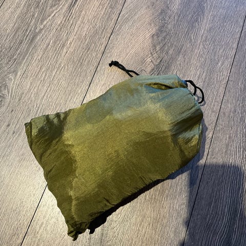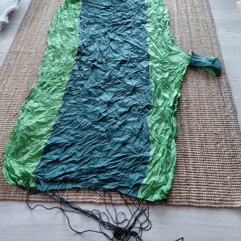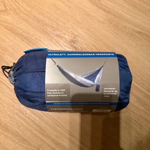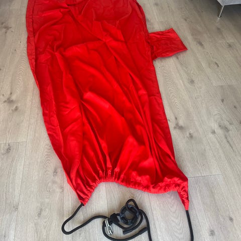 Hengekøye i stoff med røde og gule striper. Har to tauender for oppheng. 100 kr
