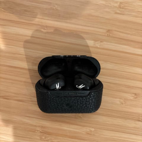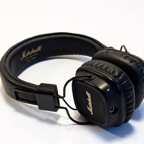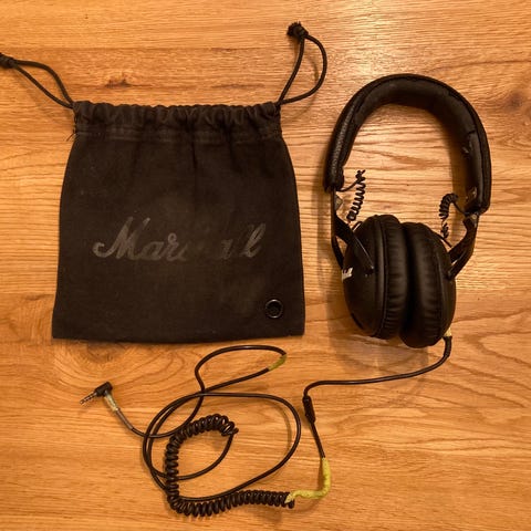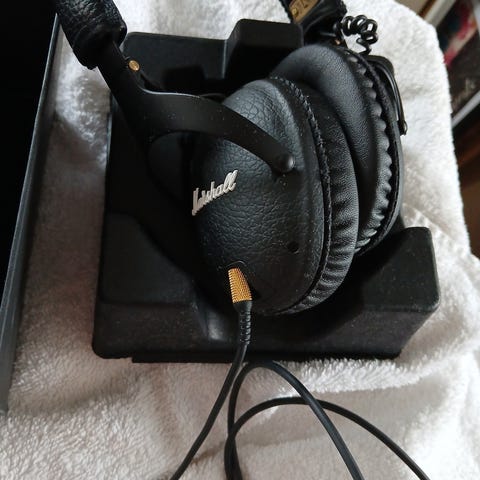 Marshall hodetelefoner med polstrede øreputer og justerbar hodebøyle. Kabeltilkobling med 3,5 mm plugg. Designet for over-ear bruk.