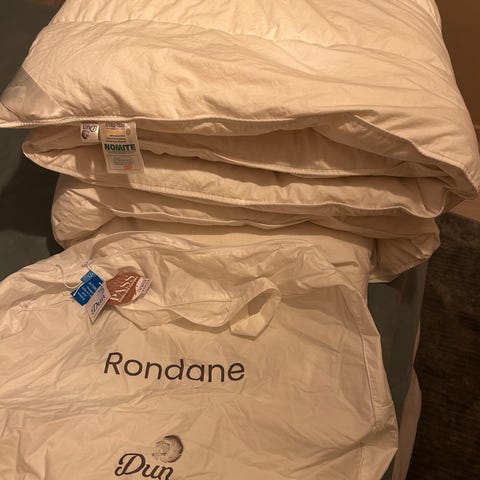Fra nettsiden: praktisk, deilig og lett dunpledd, fylt med 90% andedun, laget for å holde deg varm og god sommer som vinter.