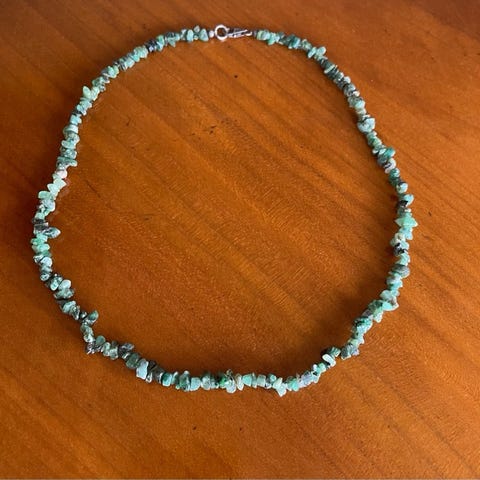 Nydelig halskjede med diverse stener. Er litt usikker på hva materiale og uva type stener det er. Drop 32 cm.