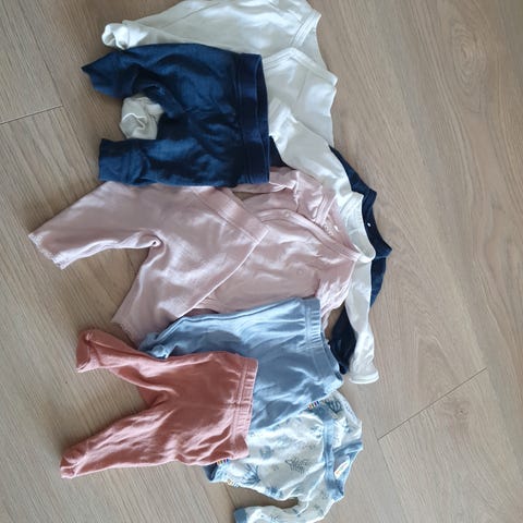 Joha/Reflex/H&M/So cute barneklær i størrelse 44/50, ulike farger og designet for unisex bruk. Inneholder flere plagg som bodyer, bukser og lue.