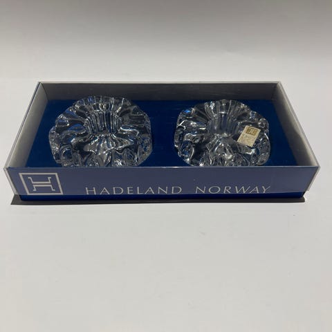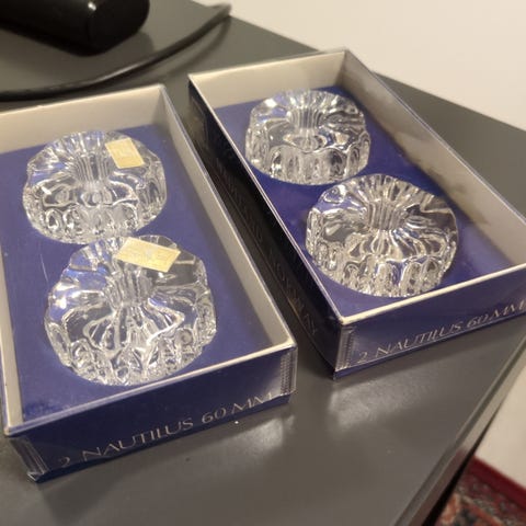 Hadeland Glassverk nautilus glasslysestaker i klart glass. Settet består av flere lysestaker. Jeg har 7 stykker til sammen. Én stor, fire mindre og to små. Selges samlet.