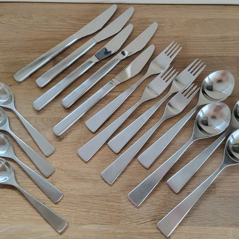 Helt nytt Skaugum bestikksett 18 deler i børstet stål. Kommer i nydelig pakkeske. Ny pris er 3750 kr.