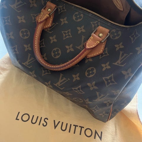 Louis Vuitton lær veske for unisex. Vesken har ikonisk monogrammønster og lærhåndtak. Passer til daglig bruk med romslig innside. Materialet er slitesterkt lær.