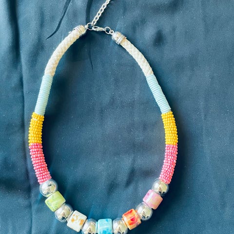 Esklusivt og unikt smykke med lilla stener og sølvfargete detaljer. Jeg er usikke på hva materiale det er. Lengden på selve kjedet er 56 cm og anhenget er 8 x 10 cm.