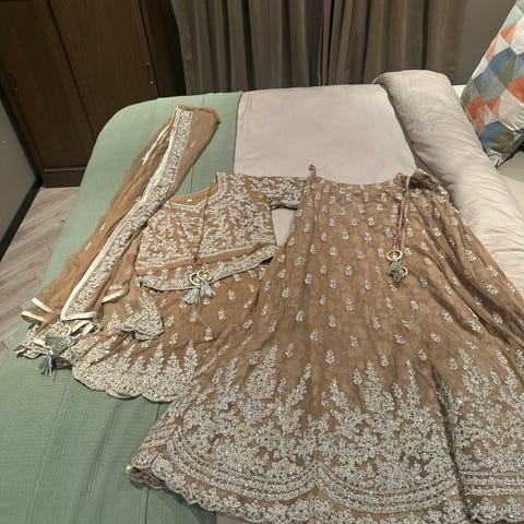 Selger et spektakulært og luksuriøst Lehenga Choli-sett i dyp oransje med tungt gullbroderi og vakre steindetaljer. Antrekket har en rikt dekorert lehenga (skjørt), matchende choli (bluse) og en elegant mørkeblå dupatta med gullmønster.