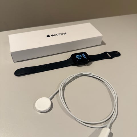 Apple Watch med mørk reim og tilhørende lader. Klokken har en rektangulær skjerm og kommer med magnetisk ladekabel for enkel lading.
