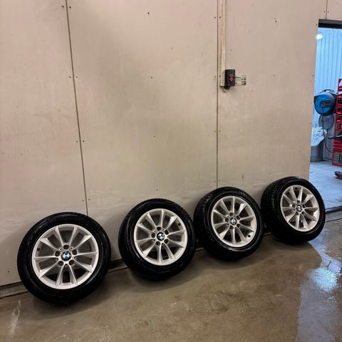 Komplette hjul, hele og pene. Kommer fra BMW 1-serie og er originale M felger. Dekk fra Triangle med masse mønster og alle pigger inntakt. Selges samlet. Felgbredde foran 7x17 og bak 7,5x17.