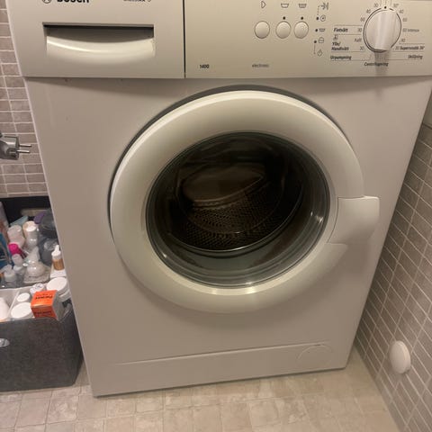Bosch Compact frontmatet vaskemaskin med hvitt kabinett og rund dør. Maskinen har flere vaskeprogrammer og kontrollpanel med knapper og dreiebryter for enkel bruk.