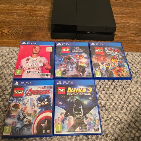 Pent brukt PS4 selges med to velfungerende kontrollere, ladestasjon og 7 artige spill, som ulike fifa utgaver og minecraft. Konsollen ble kjøpt i 2019 og er siden pent brukt og i god stand.