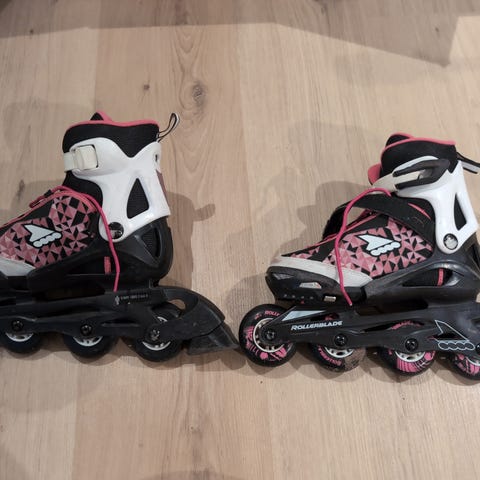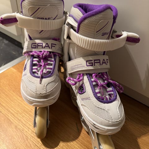 Graf rulleskøyter for barn i justerbar størrelse 33-37. Rulleskøytene har svart og blå farge, og er designet for barn. Egnet for bruk innen rulleskøytesport. Godt brukt, men mye bruk igjen. Hentes etter avtale. Sender ikke.