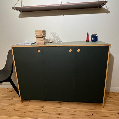 Selger et elegant underskap med fronter i linoleum i en dyp grønn farge ( CONIFER samt OLIVE på benkeplate ). Møbelet har et tidløst, eksklusivt uttrykk og har kun stått på utstilling. Veldig lite brukt og i svært god stand.
