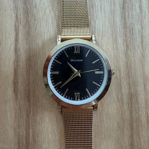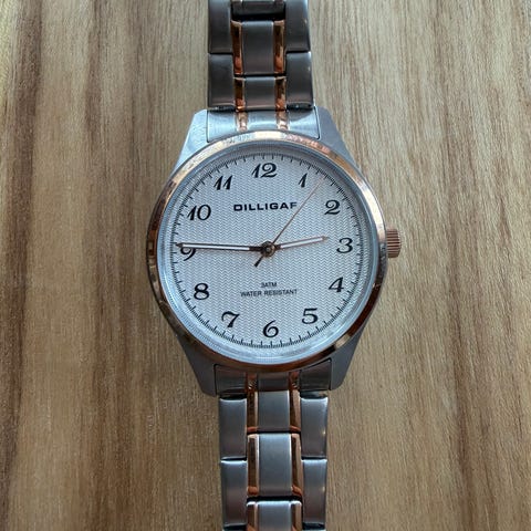 Klokken har en sølvfarget skive med tydelige romerske tall. Vanntetthet 5 ATM som vil si at den tåler noe vann, men bør ikke bades og dusjes med.