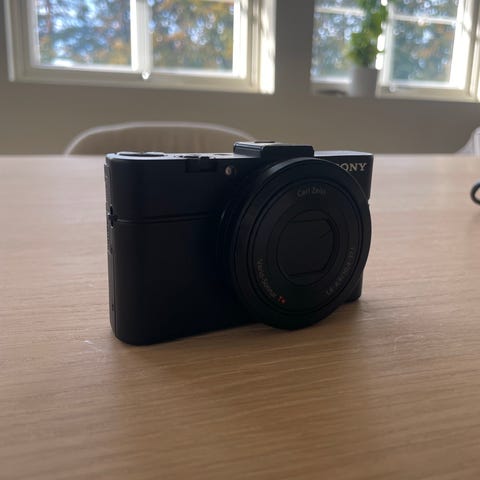 Sony RX100 kompaktkamera i svart farge. Kameraet har en ZEISS-objektiv og et kompakt design som passer til allsidig fotografering.