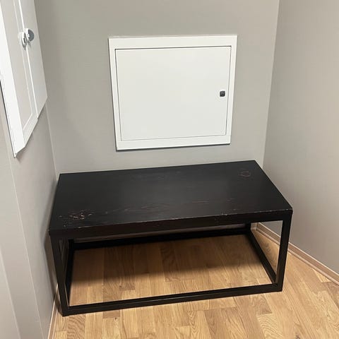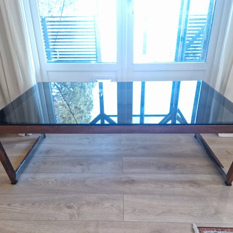 Solid mørkt tre med stor glassplate.