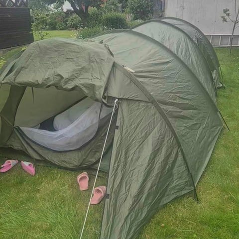 Posen er revet opp, men teltet er helt og fint.
