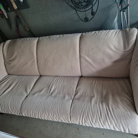 Gruppen inneholder en sofa og 3 stoler. Det er et lite hull nederst på sofaen, skadd under transport. Kan fikses enkelt. En stol er noe slitt på toppen, og to stoler har små merker på ermlenet.