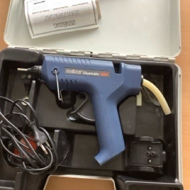 Hendig limpistol med robust koffert og utforming som gjør at den kan stå stabilt av seg selv.