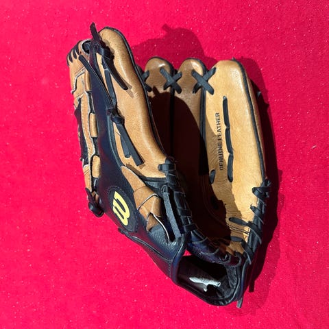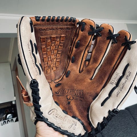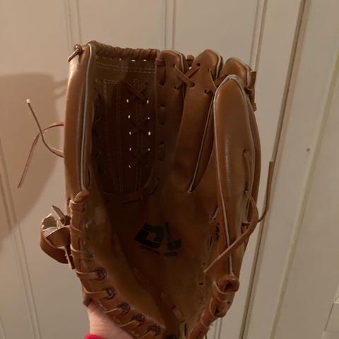 Baseballhanske i brun farge laget av lær. Hansken har snøring i svart og flettet mønster på innsiden av hånden. Designet for bruk med én hånd, egnet for baseballspill.