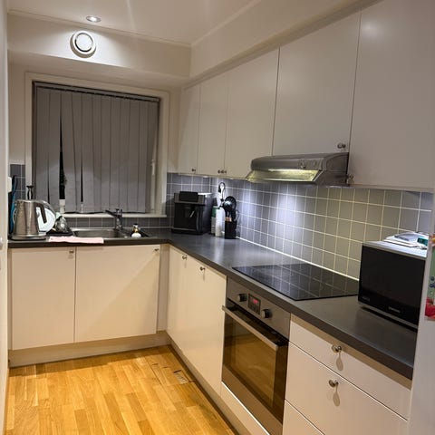 Grått kjøkken med integrerte hvitevarer inkludert ovn, platetopp og oppvaskmaskin. Ventilator, blandebatteri og vask er også inkludert. Kjøkkenet har lys grå fronter og en benkeplate i imitert tre. Salg av kjøleskap kan også diskuteres men trenger den i løpet av januar inntil nytt kjøkken er på plass.