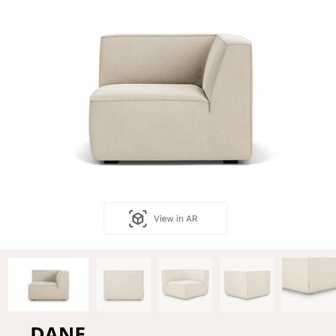 Sofa, lenestol og puff med oppbevaring. Slitesterk stoff med dun innmat. Kjøpt på bolia for 70.000kr