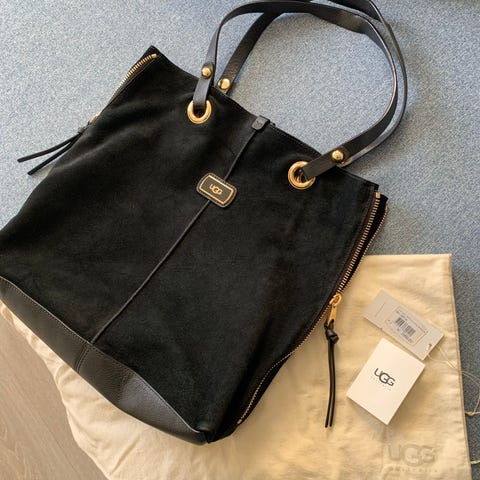 Gucci stoff veske for dame. Vesken har en svart farge med beige og mørke håndtak. Den har en frontlomme med glidelås og en romslig hoveddel med glidelås. Vesken har et enkelt design med detaljer i stoff og skinn. Egnet for daglig bruk og oppbevaring av personlige eiendeler.