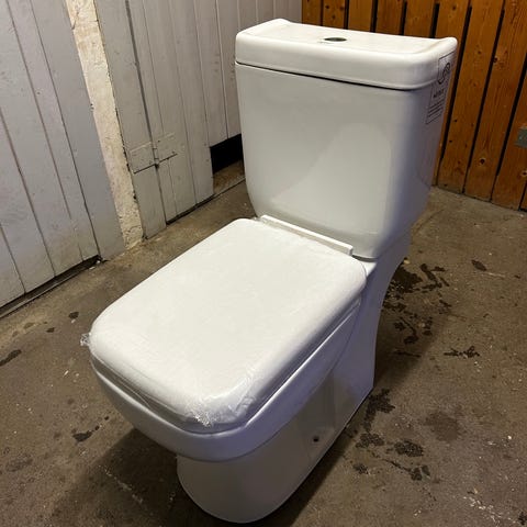 Toalett uten sisterne laget av hvitt porselen. Designet for standard installasjon i baderom. Setet og lokket følger med toalettet.