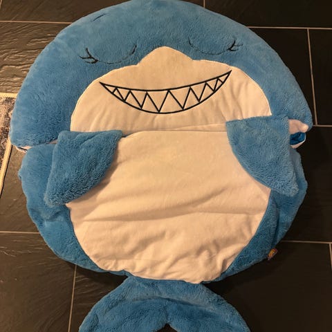 Sovepose for barn i hai motiv og innebygget pute. Den passer til barn fram til de er ca 135 cm høy.
