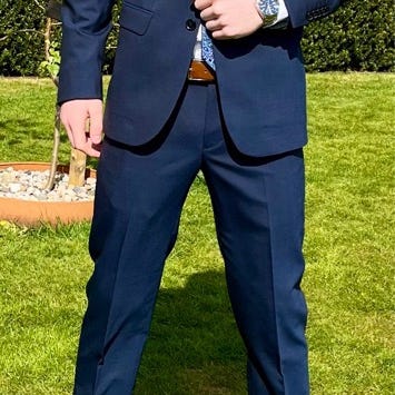 Mørk blå dress med hvite striper og vest.