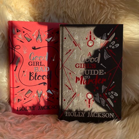 Holly Jackson A Good Girl's Guide to Murder. Det er en spenningsroman som følger etterforskningen av en skolemordsak.